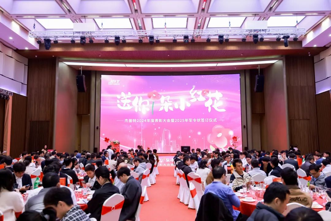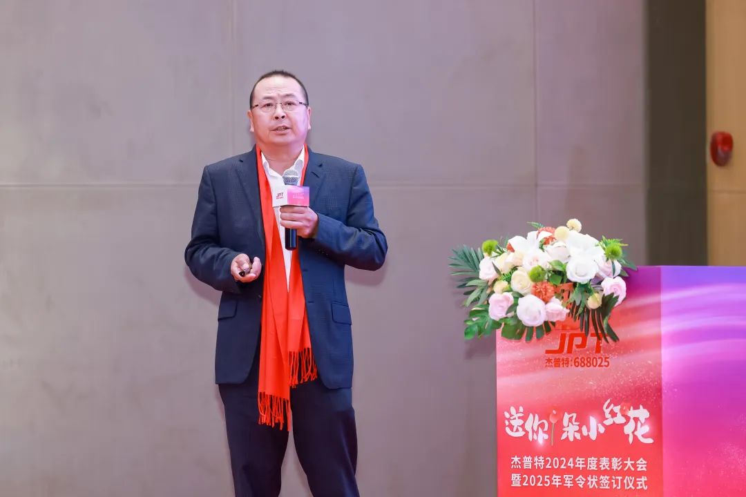 杰普特2024年度表彰大會暨2025年軍令狀簽訂儀式在公司高管們的傾情獻唱中拉開序幕,熟悉的旋律和滿懷深情的歌聲,為全體杰普特人送上新春的祝福,也點燃了現場激情。正如《送你一朵小紅花》所唱:“送你一朵小紅花,開在你心底最深的地方。” 這朵榮譽之花,屬于每一位勇敢追夢、無畏前行的杰普特人。正是他們的汗水與信念,讓公司在激烈的市場競爭中穩步前行,向著更高的目標昂首邁進!