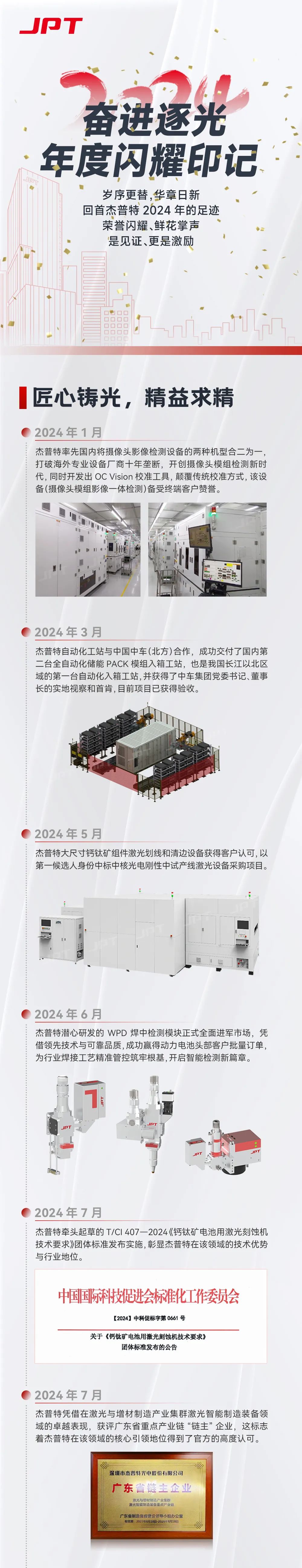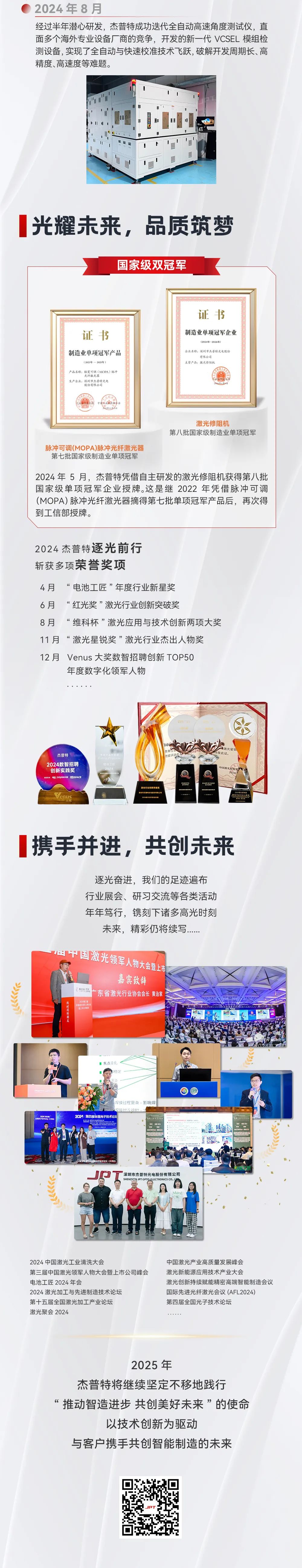 回首杰普特 2024 年的足跡,這一年榮譽(yù)閃耀、掌聲鮮花,是見(jiàn)證,更是激勵(lì)。這一年,杰普特以匠心鑄光,精益求精,引領(lǐng)激光科技新高度。從新品發(fā)布到榮譽(yù)加持,我們的每一步都鐫刻著創(chuàng)新與品質(zhì)的追求;這一年,深耕核心激光技術(shù),聚焦激光核心模塊,技術(shù)實(shí)力再攀高峰。激光修阻機(jī)斬獲“第八批國(guó)家級(jí)制造業(yè)單項(xiàng)冠軍”等多項(xiàng)榮譽(yù),彰顯行業(yè)認(rèn)可;這一年,攜手全球客戶與合作伙伴,共創(chuàng)更多非凡瞬間。
