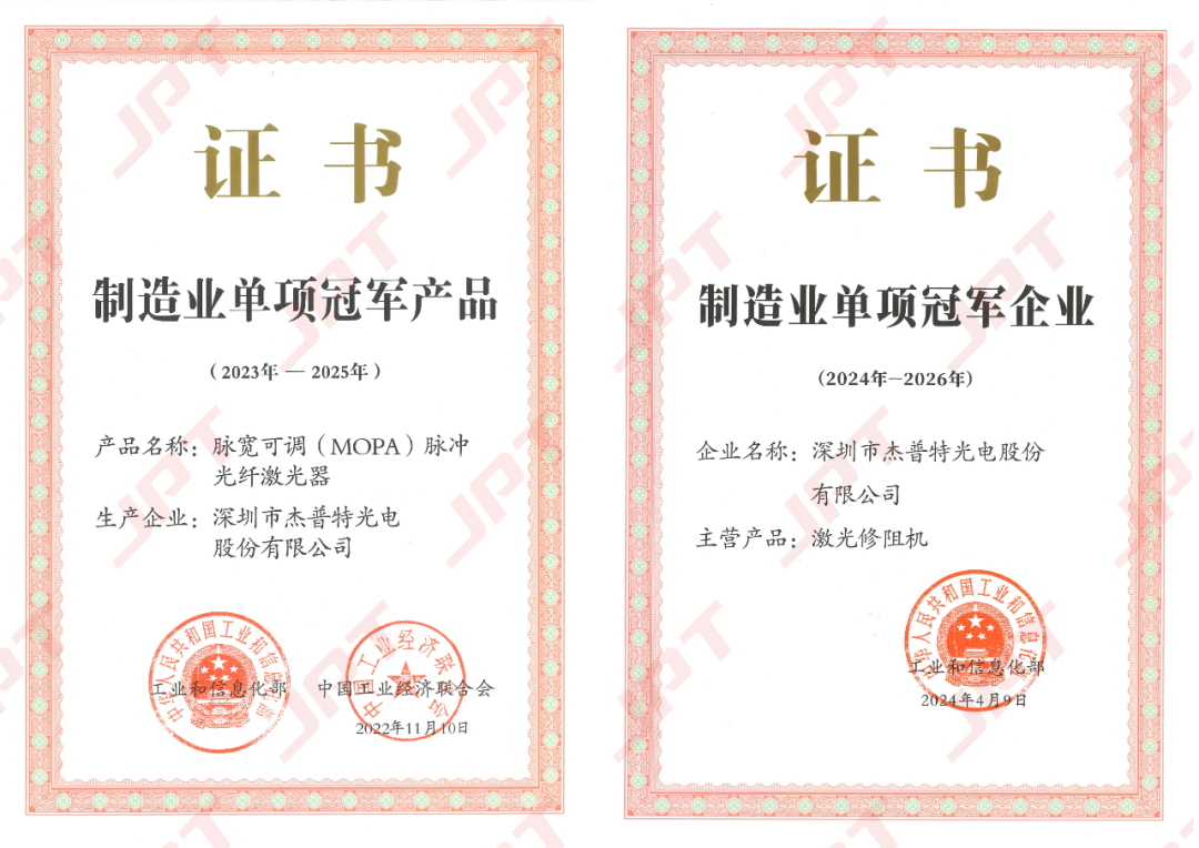 杰普特作為MOPA脈沖光纖激光器領域的全球領航者,始終堅持“激光+”的定位,深耕核心激光技術,聚焦激光核心模塊。公司先后榮獲“脈沖可調(MOPA)脈沖光纖激光器”第七批國家級制造業單項冠軍產品和“激光修阻機”第八批國家級制造業單項冠軍企業,彰顯了行業領先實力。