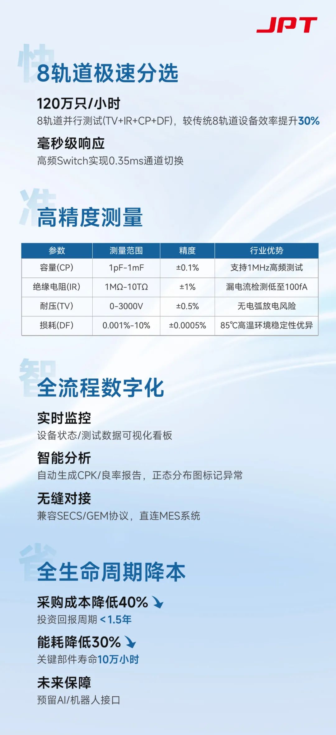 杰普特控股子公司厚薄科技,傾力打造MLCC高速測試分選機,以 “8軌道并行測試+全自主模塊化儀表+自主生態的軟件系統” 硬核架構,破解行業難題: